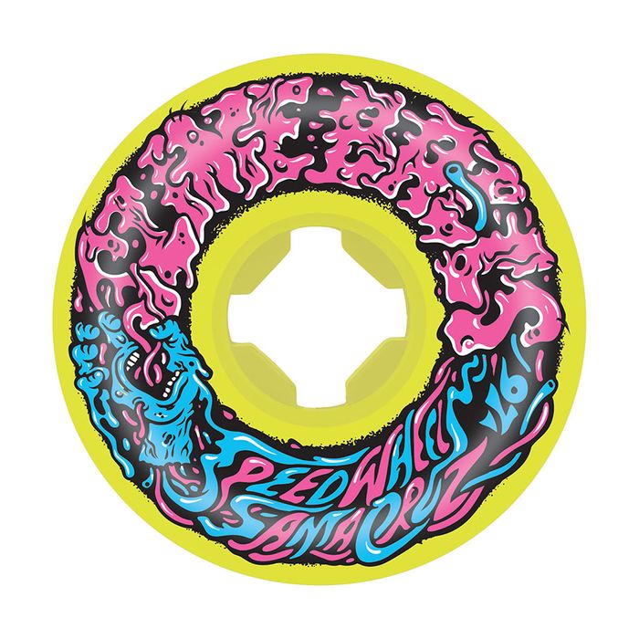 New Vomit Mini art by FALU (@falucarolei). Wide asymmetrical shape featuring a rounded back and a conical front with a wider riding surface for increased lock-in on grinds and control on all surfaces.High performance 97a urethane.
