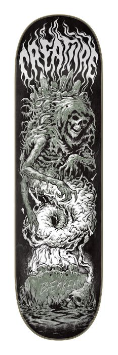 Hail the return of B√¶kkel's Graveyard Pro 1-Off board. One graphic so badass it couldn't stay buried, only to return with a colder and grimmer colorway, this time on his go-to 8.6" plank. Art by @bargainbinblasphemy